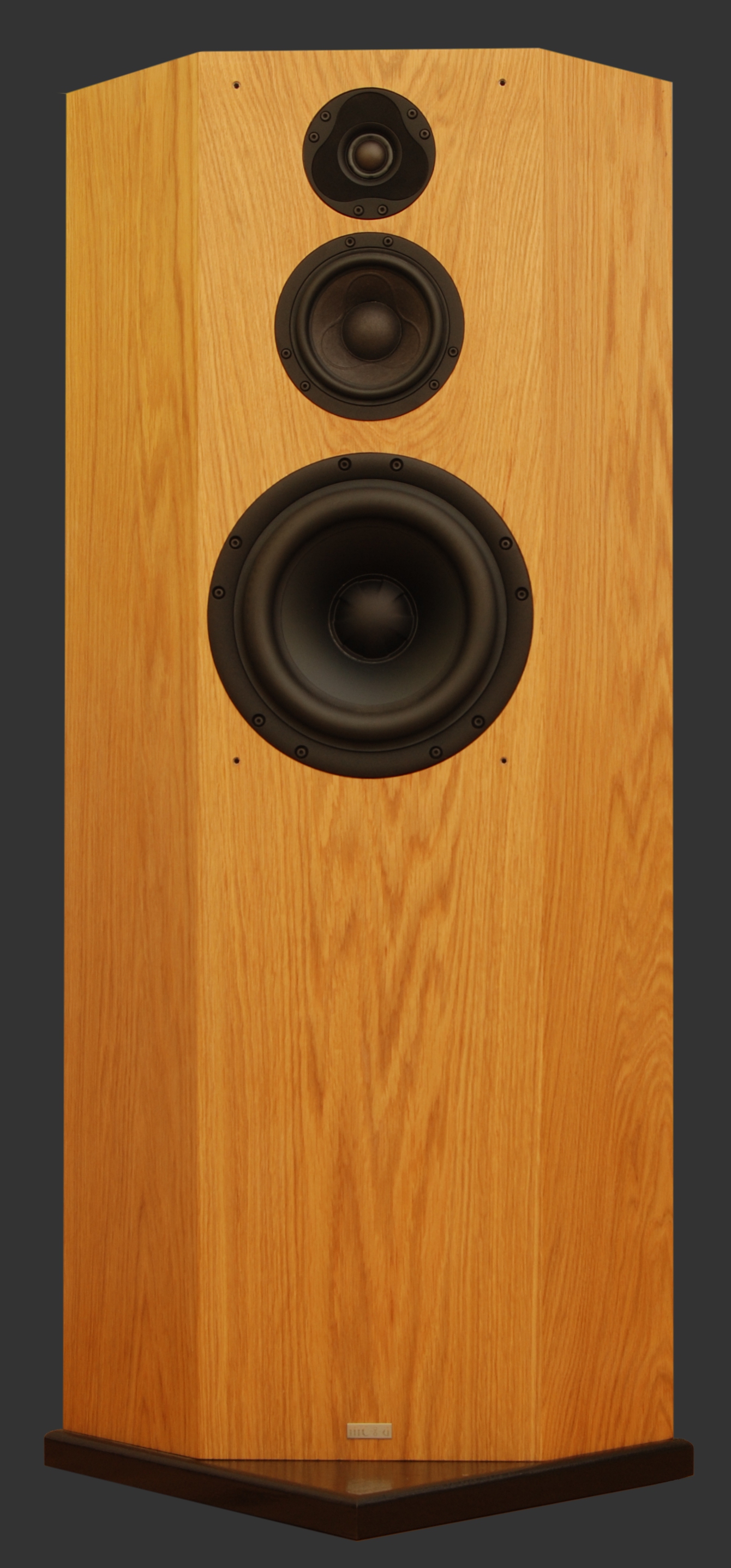 The unusual cabinet shape is designed to reduce diffraction effects by presenting to the listener a larger cabinet width, with 45 degree edges.